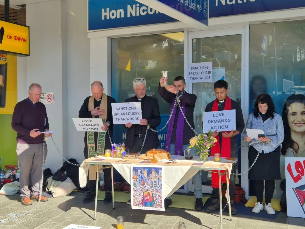 In a bold act of peaceful protest, five Anglican priests from the Diocese of Wellington, alongside Catholic priest Fr Gerry Burns, chained themselves outside the Johnsonville office of Hon Nicola Willis on Monday morning.