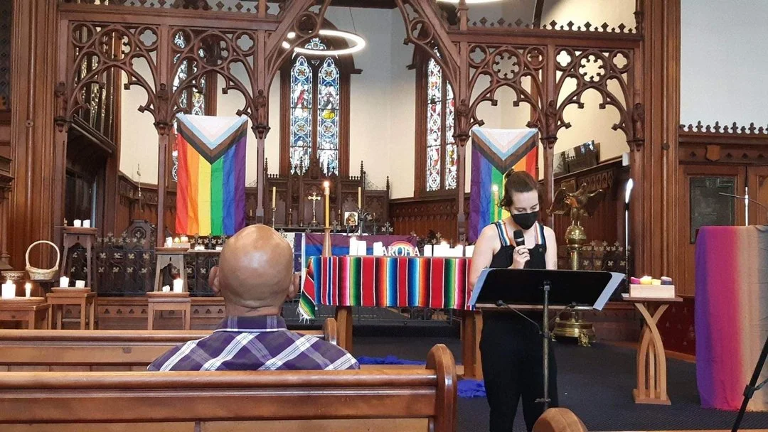 St Peter’s was decorated with inclusive pride flags, rainbows and queer icons such as Perpetua and Felicity, Sergius and Bacchus. The liturgy was specially crafted to guide the parish in imagining what worship can look like when written from the perspective of LGBT Christians. Worshippers were informed at the outset that things would be a bit different and potentially uncomfortable and invited to embrace both the discomfort and joy in celebrating differences differently.