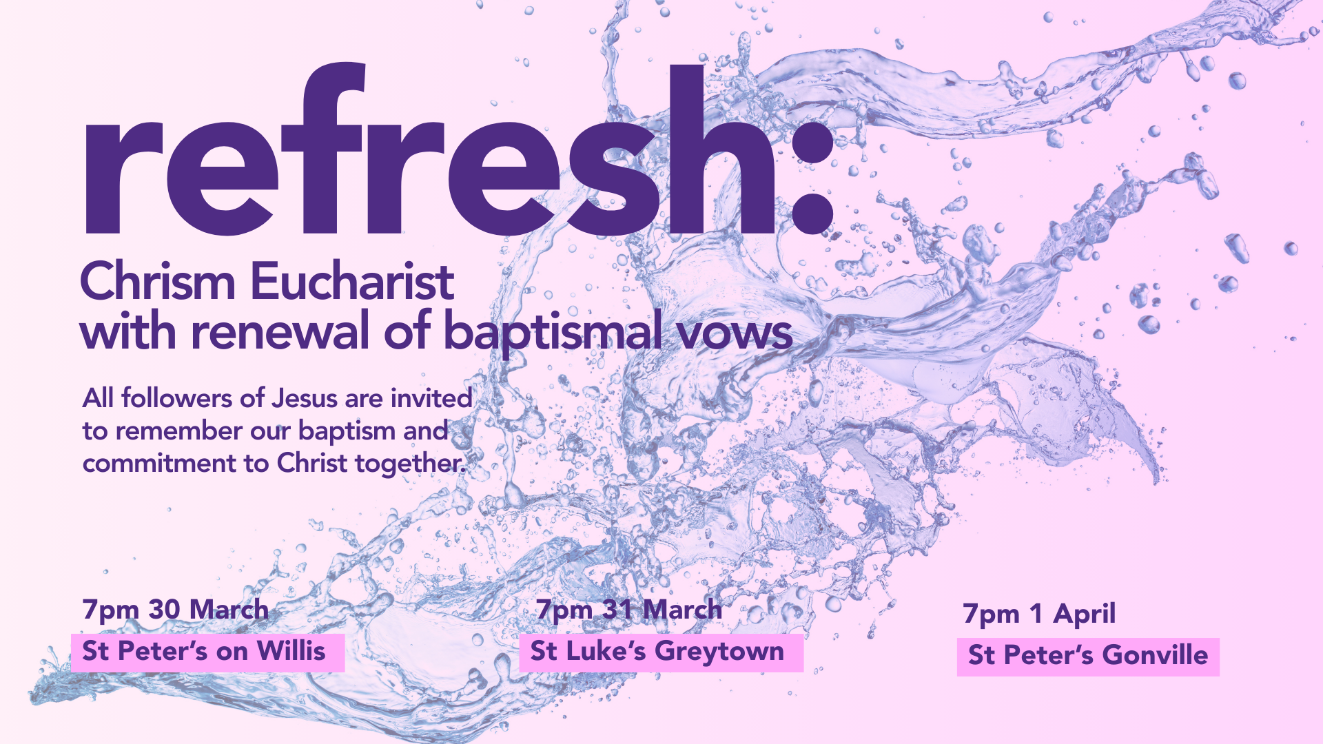 Join our Anglican Movement whānau at a Chrism - Refresh service in Wellington, Greytown or Whanganui during Holy Week.